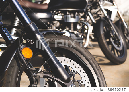 バイクツーリング 駐輪場に並ぶバイク 前輪に反射する陽射し c-1 前ボケ