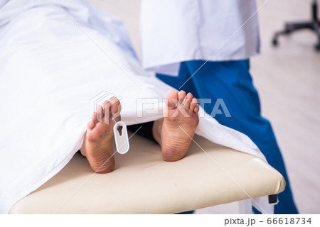 Close-up of dead men feet in a morgue with a medical mask on a toe. An unrecognizable woman has died from the coronavirus