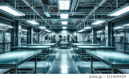 Empty morgue interior with stainless steel examination tables under fluorescent lights. Clinical blue-tinted atmosphere captures the sterile, eerie ambiance of forensic facility