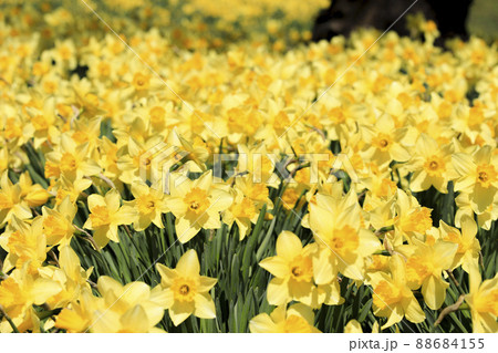 日本の早春の庭に咲く黄色いミニ水仙(テターテート)の花