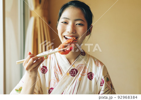 浴衣姿でエビを食べる女の子