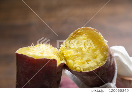 焼きたての焼き芋を半分に割る若い女性手元