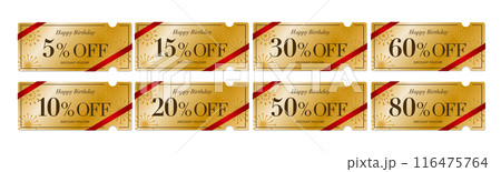 誕生日セールに使える高級感のあるシックな金のクーポンベクターアイコンセット(割引率別)