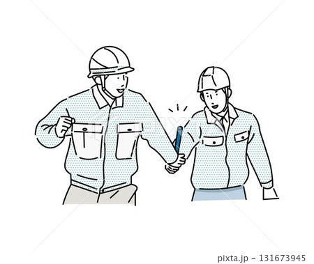 作業服を着てバトンを手渡す男性と受け取る女性ー横向きー企業ー工業、倉庫、運送系ービジネスイラスト素材