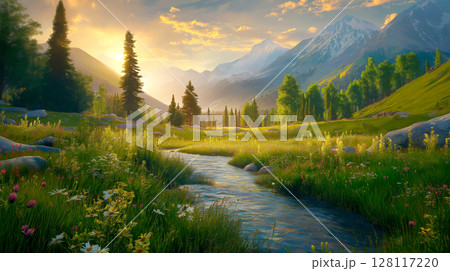Landscape imagination beautiful mountain view and lake from Fairy Meadows, Pakistan with colorful flowers in Summer morning light