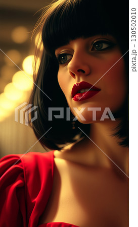 Cinematic image of beautiful woman with red lipstick on her lips, in retro style