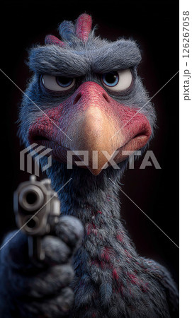 In this striking and surreal composition, a vulture takes center stage, aiming a gun directly at the viewer against a pitch-black background. Generative AI