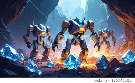 洞窟でクリスタルを採掘する未来型ロボットたち