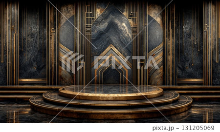 Elegant Dark Studio Backdrop with Gold Accents and Geometric Design