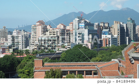 台北・劍潭の街並みと陽明山国立公園の山並み