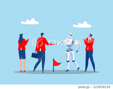 Onboarding new robot employee ,businessman manager with robot or Artificial Intelligence handshake welcome and introduce new staff to team.warm welcome to new office