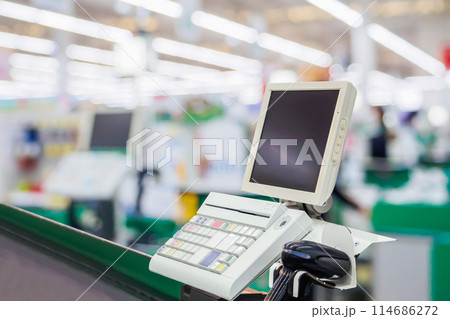 supermarket cash desk checkout counter payment terminal with blank computer monitor screen