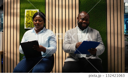 Businesswoman secretary walking with trolley cart and giving files to people sitting in line on the hallway, corporate registration forms. Candidates preparing for career opportunity. Camera A.