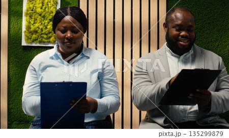 HR assistant brings registration forms papers to job seekers seated in line, job interview bureaucracy by organizing documents and resumes on trolley cart. Files details.