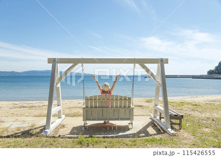 前浜海水浴場の絶景ブランコに乗る女性【長崎県南島原市】