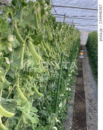 ビニールハウスでたわわに実るスナップエンドウ(品種:ニムラサラダスナップ・加温栽培)