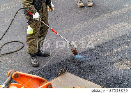 道路舗装 アスファルト プロパンバーナ 加熱 擦り付け
