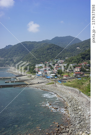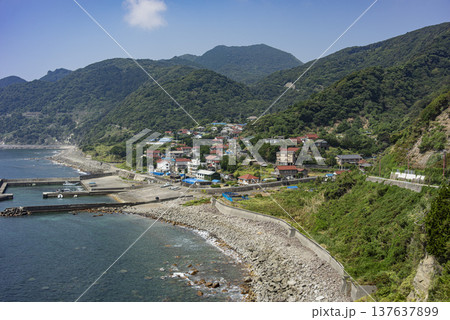 小高い丘から見た入り江にある小さな漁村