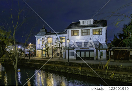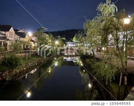 ライトアップされた倉敷美観地区の運河と倉敷館・倉敷加計美術館