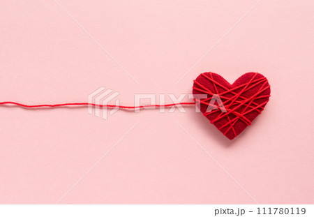 ピンク色の背景に赤色の糸で繋がったハート 糸でぐるぐるに巻いたハート
