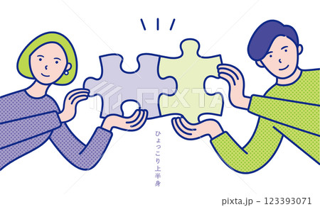 ジグゾーパズルのピースを持った男女の上半身が横からひょっこりと出ているイメージのイラスト素材【セット