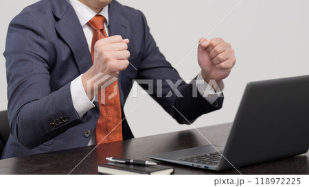 パソコンの前でガッツポーズをするビジネスマン