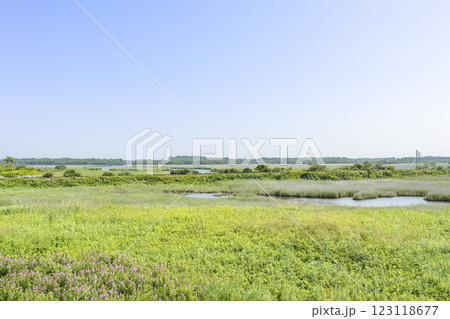 春の北海道苫小牧市ウトナイ湖の湿地帯の木道と東屋の風景を撮影