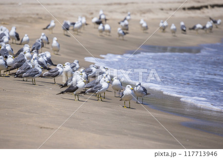 ウミネコの集まる砂浜の風景 鳥取県 浦富海岸