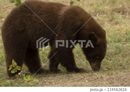 Side view to the brown bear walking in the forest and sniffing the ground.