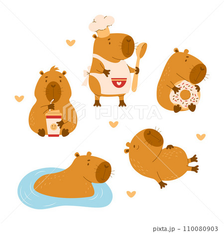 Cute Capybara character collection. Cook with spoon, with coffee and donut, in water and sleeping animal. Isolated funny rodent. Vector illustration in flat style. kids collection.
