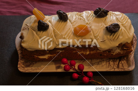 Natural homemade chocolate cake filled with cream and decorated with nuts