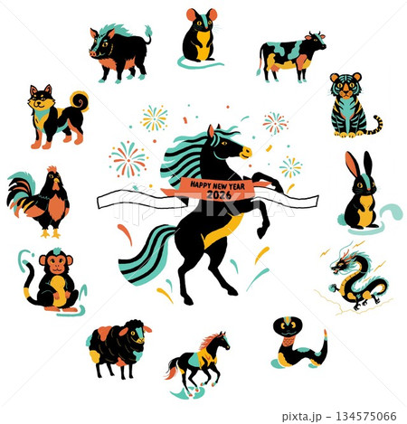 干支動物大集合の年賀状 2026年/ぬいぐるみ風キャラクターとハッピーニューイヤー