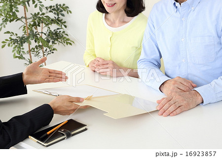 室内でセールスレディーの説明を受けている、カジュアルウェアー姿の中年男性