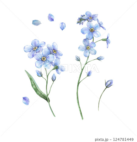 Light blue beautiful branches of forget-me-not flowers. Delicate botanical watercolor set illustration is perfect for greeting cards, wedding invitations, branding, packaging and spring design.