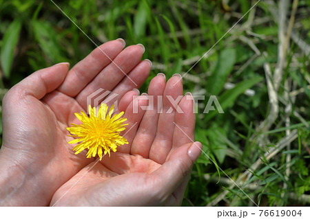 春の暖かい光に照らされたタンポポをふんわりと手で包む