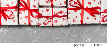 many gift boxes with red ribbon and heart. valentine or other holidays concept. top view with copy space for text or design on wooden background