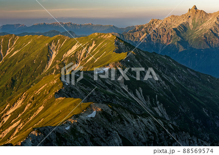 笠ヶ岳から見る夕照の槍ヶ岳と抜戸岳