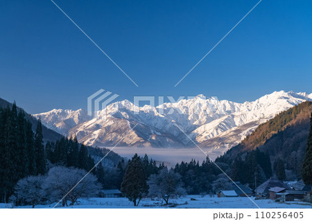 《長野県》雪景色の北アルプスの夜明け・冬の白馬村青鬼集落の眺望