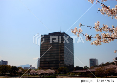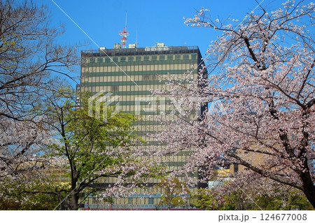 北九州市小倉の桜並木と北九州市役所 【青空】