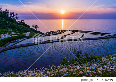 (石川県)田植の済んだ、白米千枚田・夕陽
