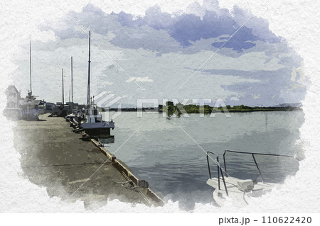 水彩画風 三国湊 九頭竜川 福井県坂井市
