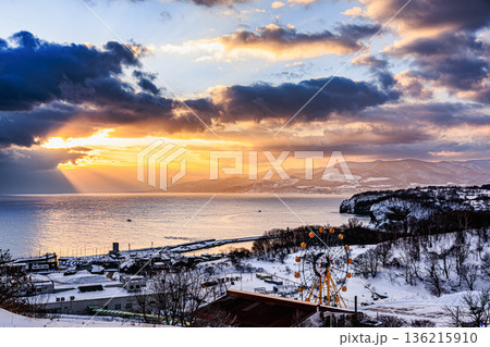 冬の祝津パノラマ展望台から望む小樽の海と朝景