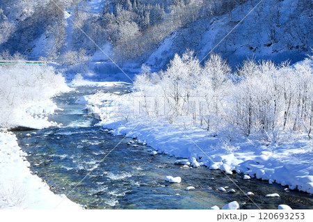 川霧が立つ姫川と雪原【北安曇郡白馬村】
