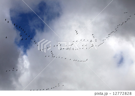 【渡り鳥の春の渡り:北帰行】群れで渡る鳥たちは、体力を使う先頭を入れ代わりながら、長距離を渡っていく
