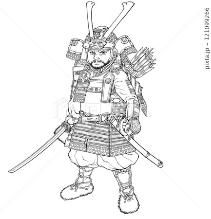 刀を持って正面を向く鎌倉武士 線画
