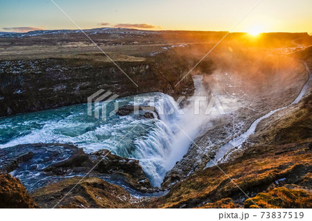 アイスランド・グトルフォスの滝と朝焼け
