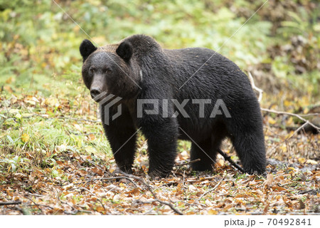 落ち葉の中の大きなヒグマ