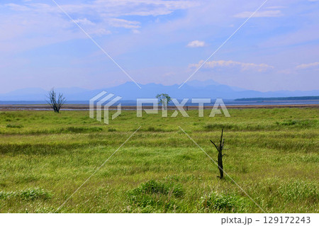 北海道・根室春国岱の立ち枯れたトドワラ林と湿原風景
