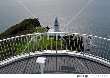 地球岬灯台 白亜の灯台 北海道室蘭市 展望台の柵を入れて