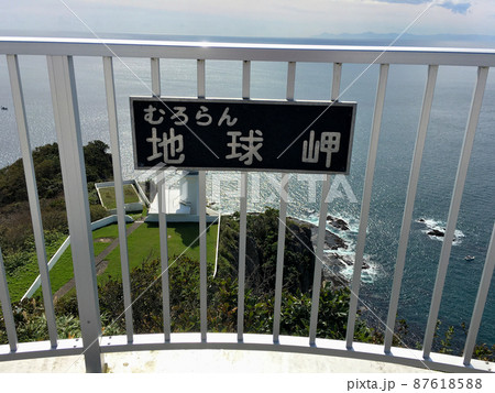 室蘭市にある地球岬の展望台に書かれた地球岬 と Cape Chikyu の文字 別アングル